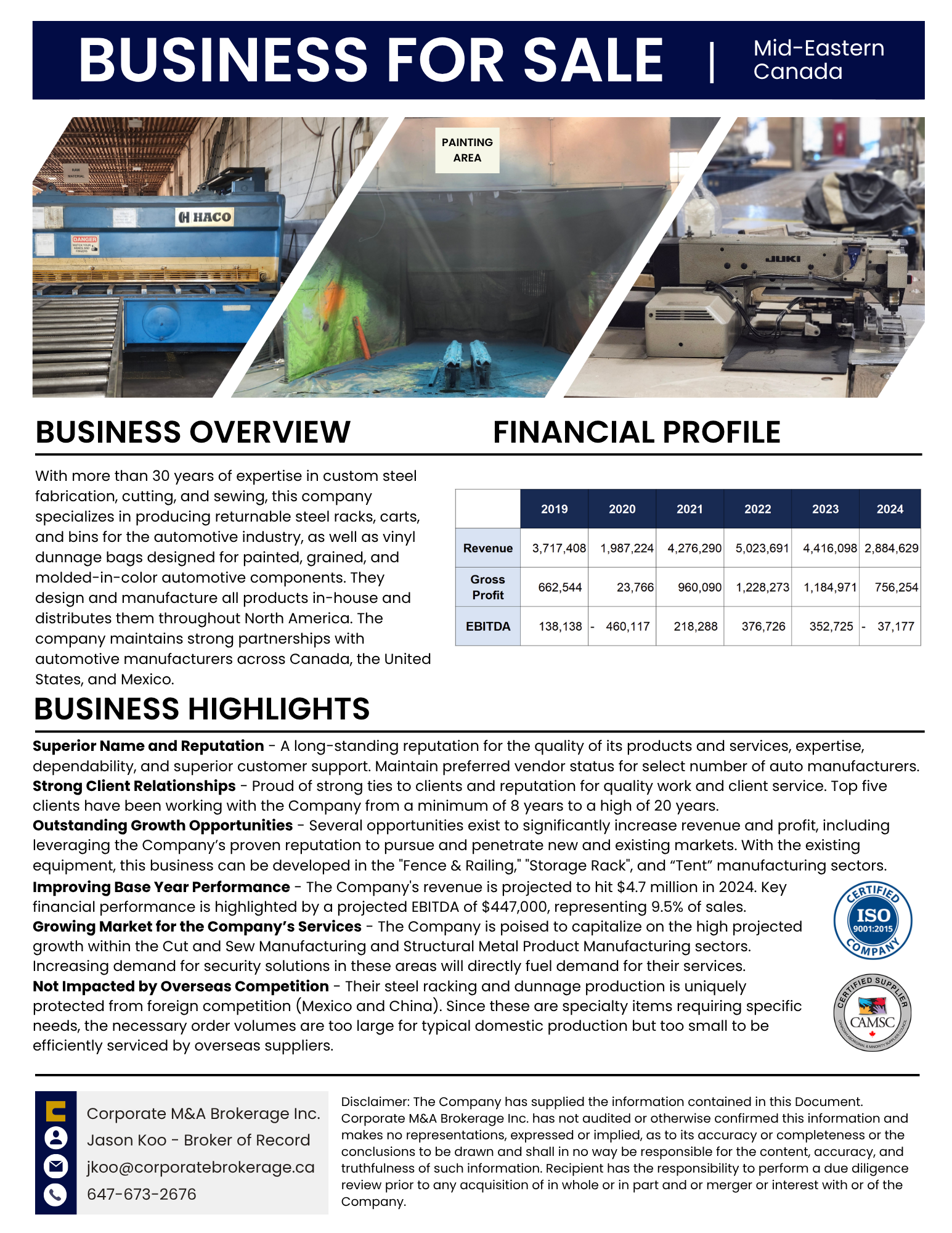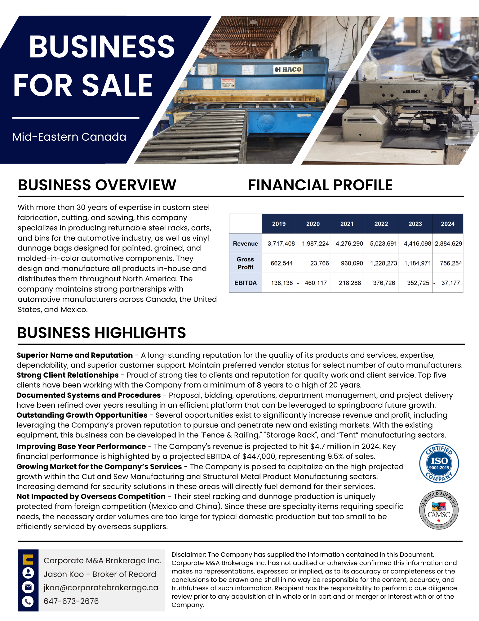 This business has been in Metal Fabrication & Industrial Fabrics manufacturing for over 30 years. They specialize in producing returnable steel racks, carts, and bins as well as vinyl dunnage bags and molded-in-color automotive components.